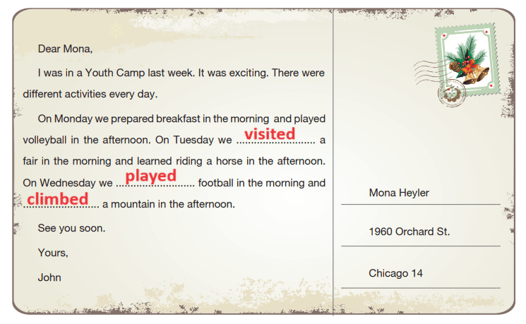 17. Look at the schedule and read John’s postcard. Then, fill in the blanks.