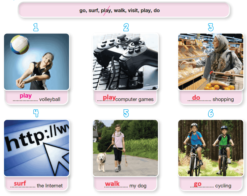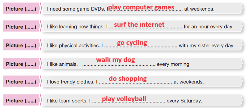 Now, write the activities in the extra three pictures in the boxes below. You can use your dictionary.