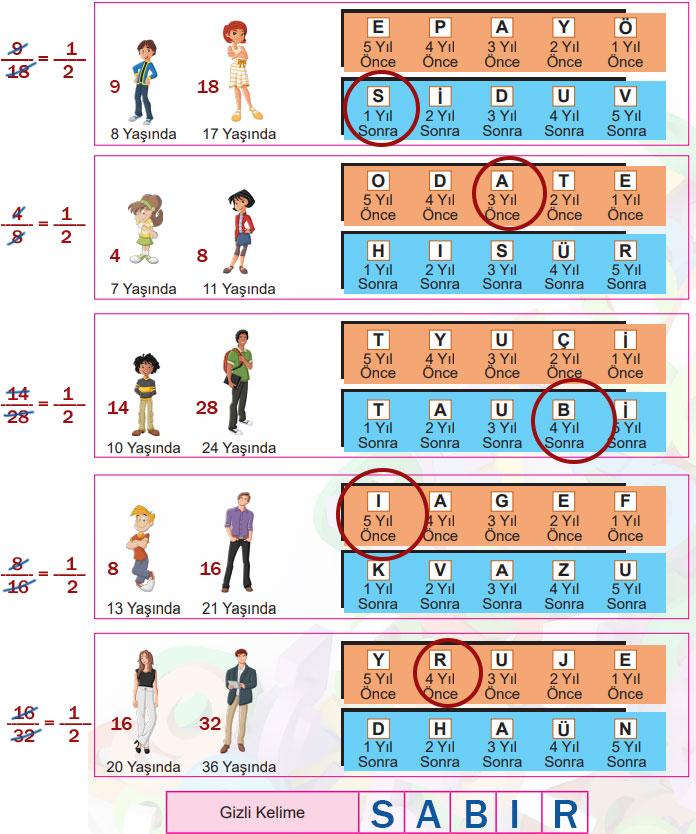 Bu kişilerin yaşlarının oranının kaç yıl öncesinde ya da kaç yıl sonrasında 1/2 olacağını bulunuz. Her bir seçenek için bulduğunuz sonucun üzerindeki karesel bölgeyi boyayınız. Boyadığınız karesel bölgelerdeki harfleri sırasıyla en alttaki şifre kutusuna yazarak gizli kelimeyi bulunuz.