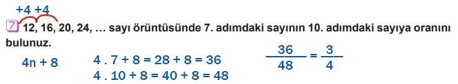 7-) 12, 16, 20, 24, … sayı örüntüsünde 7. adımdaki sayının 10. adımdaki sayıya oranını bulunuz.
