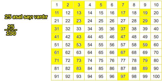 9-) Burçe, 100’lük tablo çizip 1’den 100’e kadar sayıları yazıyor. Bu tabloda asal sayıları boyuyor.