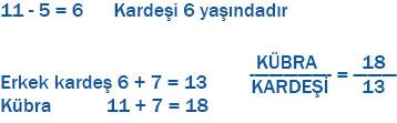 4-) Kübra erkek kardeşinden 5 yaş büyüktür. Kübra şimdi 11 yaşındadır. Kübra’nın yaşının, erkek kardeşinin yaşına oranının 7 yıl sonra kaç olacağını bulunuz.