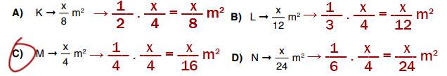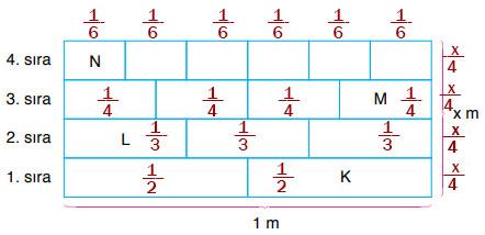 Yukarıdaki dikdörtgenin uzun kenar uzunluğu 1 m, kısa kenar uzunluğu x m’dir. Dikdörtgen 4 eş sıraya ayrılıp her sıradaki dikdörtgenler, şekildeki gibi kendi içinde eş parçalara ayrılmıştır. Bu parçalardan bazıları harflendirilmiştir. Harflendirilen parçalar ile bu parçaların alanları aşağıda eşleştirilmiştir. Hangi eşleştirme yanlıştır?