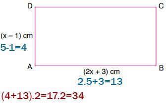 3) Yandaki ABCD dikdörtgeninde IABI = (2x + 3) cm, IADI = (x – 1) cm’dir. x = 5 cm için ABCD dikdörtgeninin çevre uzunluğu kaç cm’dir?