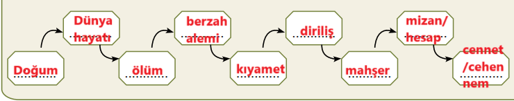 Aşağıda insanın dünya ve ahiretteki yolculuğunu belirten duraklar karışık olarak verilmiştir. Bunları yaşanma sırasına göre sıralayınız.