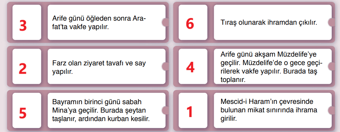 Haccın aşağıda karışık olarak verilen aşamalarını, yapılış sırasına göre numaralandırınız.