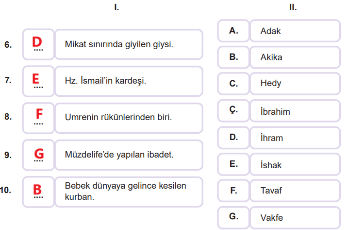 Aşağıda II. sütunda ünitede geçen bazı kavramlar, I. sütunda bu kavramların açıklamaları verilmiştir. Cümlelerin önündeki kutucuklara ilgili kavramın harfini getirerek eşleştiriniz.
