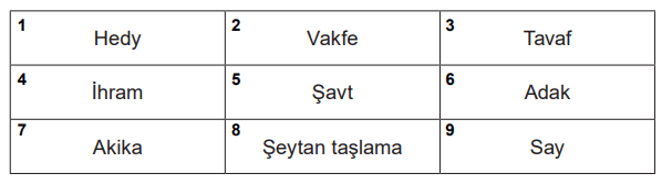 Aşağıda verilen tablodaki kutucuklarda hac, umre ve kurban ibadetleriyle ilgili kavramlar bulunmaktadır. Kutucuklardaki numaraları kullanarak soruların cevaplarını yazınız.