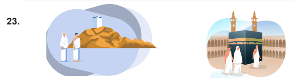 Cevap: Birinci resim Arafat dağıdır ve burada vakfe yapılır. İkinci resim ise Kabe’dir burada da tavaf yapılır.