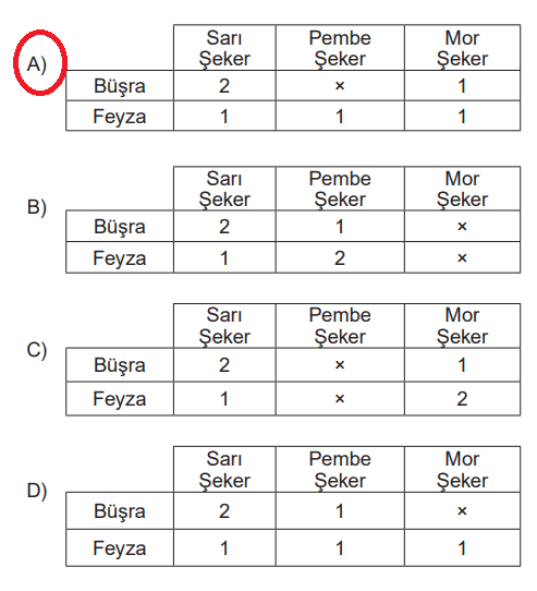 Buna göre Büşra ve Feyza’nın aldığı şekerler hangi seçenekte doğru olarak verilmiştir?