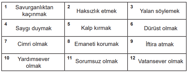 1. Aşağıdaki tabloda güzel ahlak konusuyla ilgili bazı davranışlar bulunmaktadır. Kutucuklardaki numaraları kullanarak soruların cevaplarını yazınız.