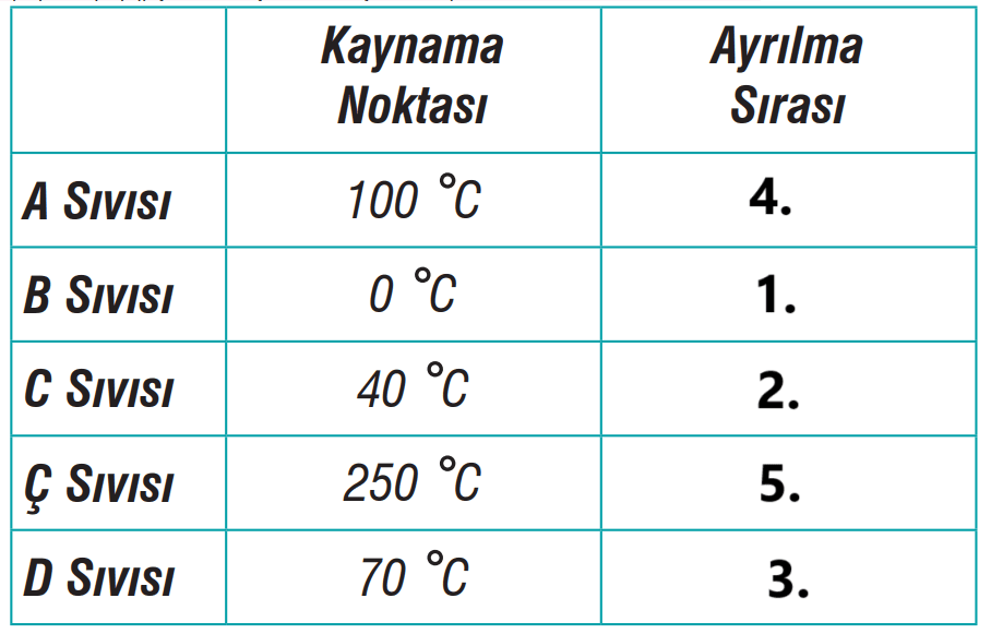 5 numaralı kapta birbiri içerisinde çözünen sıvıların şekildeki düzenek ile birbirinden ayrılması istenmektedir. Buna göre bu sıvılardan oluşturulan karışımda, hangi maddelerin hangi sıra ile kaptan ayrılacaklarını yanlarındaki kutulara yazınız.