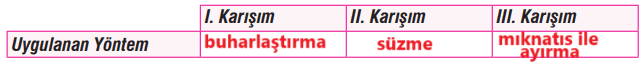 Bu maddeleri kullanarak hazırlanan karışımlar, aşağıdaki tabloda verilmiştir. Bu karışımları, kendisini oluşturan maddelere ayırmak için uygulanabilecek yöntemleri yanlarındaki boşluklara yazınız.