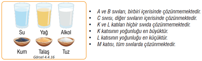 1. Fen bilimleri dersinde yapılan bir etkinlikte kullanılacak malzemeler ve bu maddelerin birbiri içerisinde çözünme durumları ile ilgili bilgiler aşağıda verilmiştir.