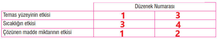 1. Fatih temas yüzeyinin, sıcaklığın ve çözünen madde miktarının çözünme hızına etkisini araştırmak istiyor ve görsellerdeki düzenekleri hazırlıyor. Fatih’in kullanması gereken düzenek numaralarını aşağıda verilen tablodaki ilgili kutulara yazınız.