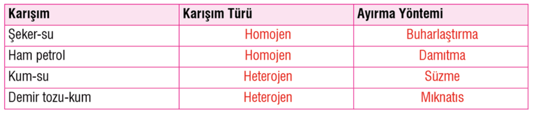 3. Aşağıdaki tabloda verilen karışımların türlerini ve bu karışımları oluşturan maddeleri ayırmak için kullanılacak yöntemleri yazınız.