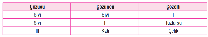 6. Aşağıdaki tabloda çözeltiler ve bu çözeltileri oluşturan maddelerin fiziksel hâlleri verilmiştir.