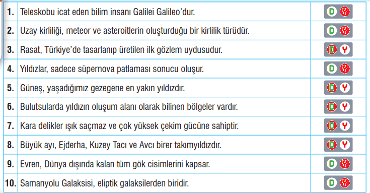 8. Yıldızların hareketlerini gözlemlemek, uzayı incelemek ve uzayla ilgili veri toplamak için inşa edilen yapılara rasathane denir.