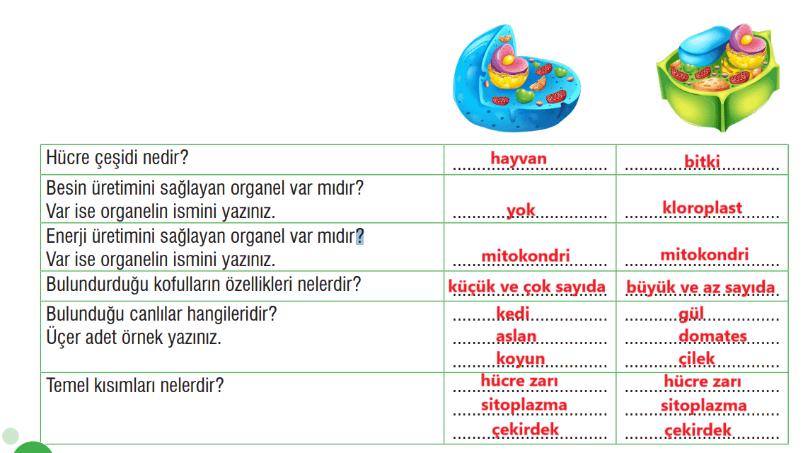2. Aşağıdaki tabloda çok hücreli canlıların sahip olduğu hücre çeşidinin modelleri verilmiştir. Modelleri inceleyerek verilen soruların cevaplarını uygun kutulara yazınız.