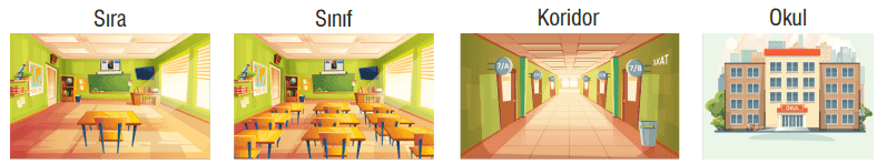 3. Aslı, bir insanda bulunan hücreden organizmaya doğru tüm yapıları belirlemiştir. Daha sonra bu yapıları günlük yaşamla ilişkili “sıra-sınıf-koridor-okul” kavramları ile eşleştirip somut hâle getirmeye karar vermiştir. Ardından her sınıf düzeyinin farklı koridorda yer aldığını hayal ederek aşağıdaki görselleri hazırlamıştır.