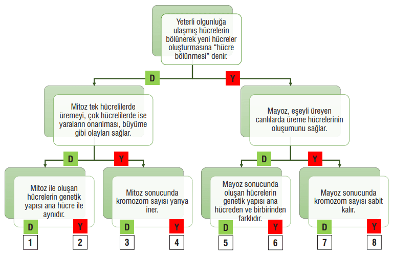 5. Aşağıda hücre bölünmesi ve bölünme çeşitleri ile ilgili çeşitli ifadeler verilmiştir. Kutular içerisinde verilen ifadelerden doğru olanlar için “D”, yanlış olanlar için “Y” oku seçilerek ilerlendiğinde çıkışa ulaşılacaktır.