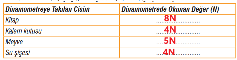 Dinamometrede ölçtüğünüz değerleri tablodaki ilgili yerlere yazınız.