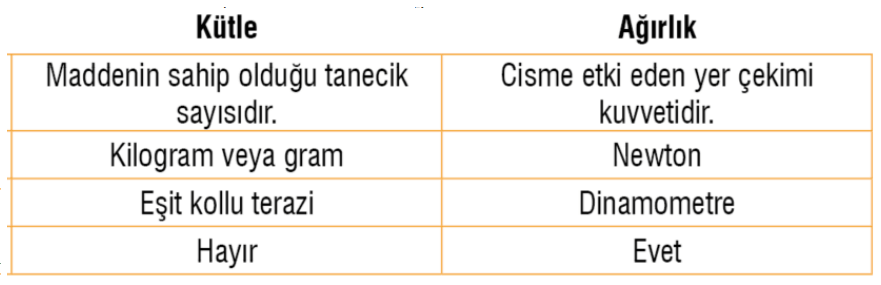 5. Kütle ve ağırlık kavramları ile ilgili aşağıdaki tabloda verilen soruları cevaplayınız.