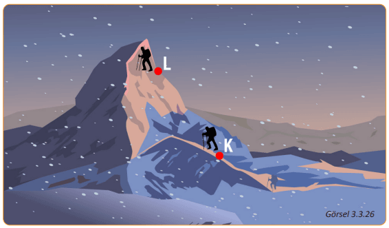 3. Bir dağcı 50 kg kütleli sırt çantası ile bir dağa tırmanmaya başlar. Bu dağcı, sırt çantasının L konumundaki ağırlığını K konumundaki ağırlığından daha az olduğunu ölçmüştür.