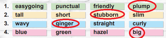 stubborn – punctual – clumsy – honest – selfish – outgoing – hardworking – beautiful