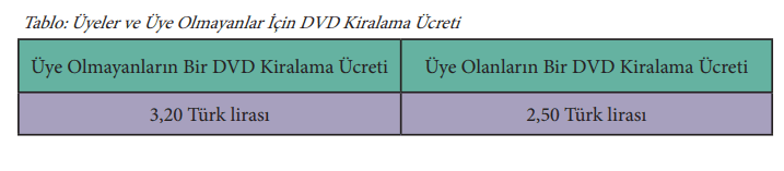 1. DVD kiralama dükkânında yıllık üyelik ücreti 10 Türk lirasıdır. Aşağıdaki tabloda gösterildiği gibi üye olanlar için DVD kiralama ücreti üye olmayanlara göre daha düşüktür