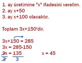 1. Görseldeki gibi bir atölyede her ay, bir önceki ay üretilen sandalye sayısının 50 fazlası kadar sandalye üretiliyor. Atölyede, üç ay boyunca toplam 285 sandalye üretildiğine göre ilk ay kaç sandalye üretilmiştir?