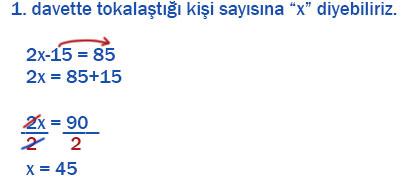2. Bir davete katılan Bülent Bey, bir önceki davette tokalaştığı kişi sayısının 2 katının 15 eksiği kadar kişi ile tokalaşmıştır. Bülent Bey, bu davette 85 kişi ile tokalaştığına göre bir önceki davette kaç kişi ile tokalaşmıştır?