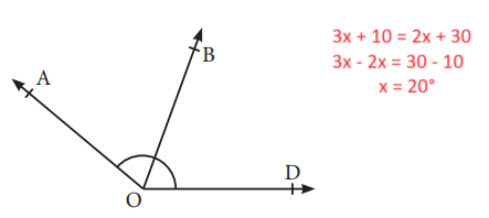 4. Şekilde [OB, AOD açısının açıortayıdır. m(AOB) = 3x + 10°, m(BOD) = 2x + 30° ise x’in değeri kaçtır?