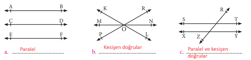 1. Aşağıda verilen doğruların birbirine göre durumlarını altlarında verilen boşluklara yazınız.