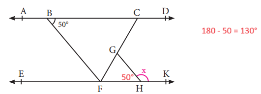 7. Yukarıdaki şekilde AD ∕∕ EK ve [GH] ∕∕ [BF] ve m(CBF) = 50° olduğuna göre x değerinin ölçüsü kaç derecedir?