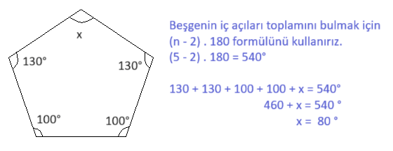 3. Bir beşgenin iki iç açısının ölçüleri 130° ve diğer iki iç açısının ölçüleri 100°dir. Buna göre verilmeyen iç açısının ölçüsü kaç derecedir?