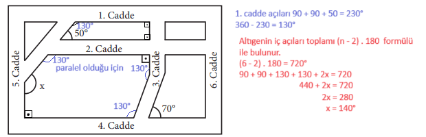 5. Krokiye göre 1. 2. ve 4. caddeler birbirine paraleldir. 5. ve 6. caddeler bu caddelere dik konumdadır. Krokide veril