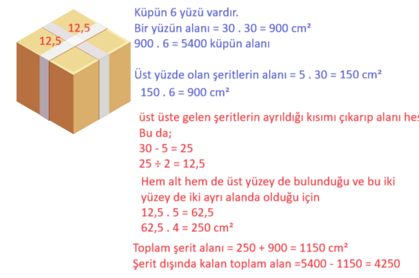 7. Bir ayrıtı 30 santimetre olan küp şeklindeki bir paketin yüzeylerine eni 5 santimetre olan şerit çekilecektir. Buna göre paketin şeritler haricinde kalan kısmının alanı kaç cm²dir?