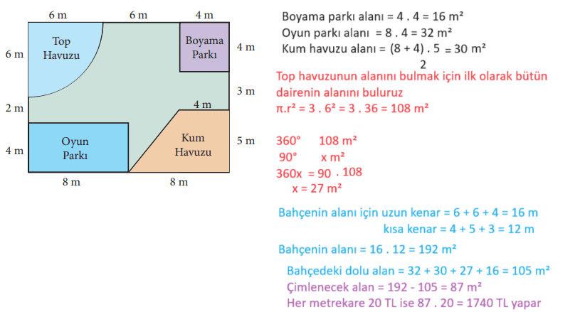 10. Bir anaokul bahçesinin planı yukarıda verilmiştir. Bu planda oyun alanlarının dışındaki bölge çimle kaplanacaktır. Kullanılacak çimin metrekaresi 20 Türk lirası olduğuna göre çimle kaplanacak alan için kaç Türk lirası harcanır?