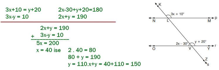 3. Yandaki şekilde p//r ve s doğrusu, p ile r doğrularını kesmektedir. m(KLM) = + 3x+10° ve (LVO) = y+20° olduğuna göre x+y toplamı kaç derecedir?