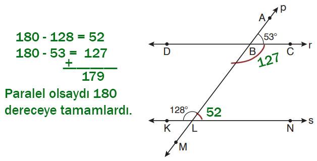 7. Yandaki şekilde p doğrusu, r ile s doğrularını kesmektedir. m(ABC) = 53° ve m(KLB) = 128° dir.