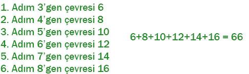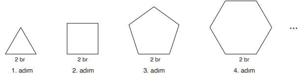 Çağlar’ın oluşturduğu şekil örüntüsündeki düzgün çokgenlerin her birinin bir kenar uzunlukları eşit ve 2 br’dir. Buna göre örüntünün ilk 6 adımındaki düzgün çokgenlerin çevre uzunluklarının toplamı kaç br’dir?