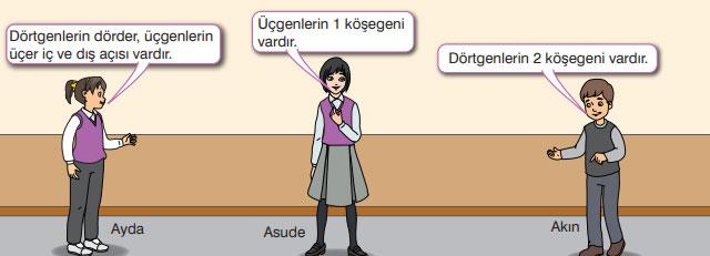 Ayda, Asude ve Akın; üçgen ve dörtgenlerin iç açı, dış açı ve köşegenleri ile ilgili fikirlerini söylüyorlar. Ayda, Asude ve Akın’ın görselde belirttikleri yorumlardan hangisi doğru değildir? Nedenini açıklayınız.