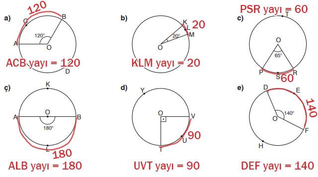 2. Aşağıdaki O merkezli çemberlerde verilen merkez açıların gördüğü yayları ve bu yayların ölçülerini belirleyiniz.