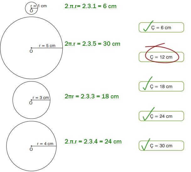 1. Aşağıda yarıçap uzunlukları verilen O merkezli çemberler ile çemberlerin çevre uzunlukları eşleştirildiğinde hangi uzunluk ölçüsü açıkta kalır (π’yi 3 alınız .)?