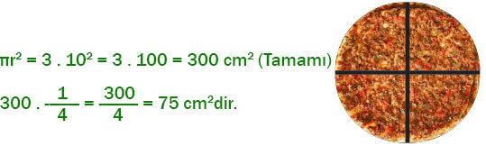 5. Oya, lokantada daire şeklinde bir adet lahmacun siparişi veriyor. Gelen lahmacunu görseldeki gibi 4 eş parçaya ayırıyor ve lahmacunun eş parçalarından birini yiyor. Lahmacunun yarıçap uzunluğu 10 cm olduğuna göre Oya’nın yediği parçanın bir yüzünün alanı kaç cm2dir (π’yi 3 alınız.)?