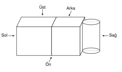 4. Birer adet dikdörtgenler prizması, küp ve dik dairesel silindir kullanılarak oluşturulan; önden, arkadan, sağdan, soldan ve üstten iki boyutlu görünümleri aşağıda verilen yapıyı oluşturunuz.