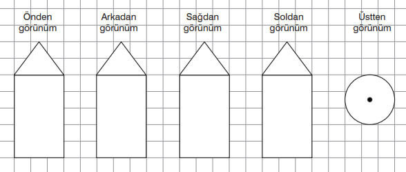 3. Tabanları eş daireler olan bir dik dairesel silindir ve bir dik koni kullanılarak oluşturulan yandaki yapının önden, arkadan, sağdan, soldan ve üstten iki boyutlu görünümlerini kareli kâğıda çiziniz.