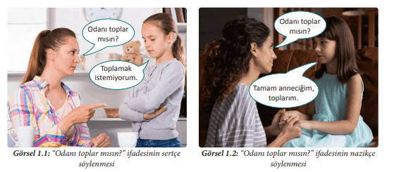 Cevap: İlk resimde kullanılan iletişim yanlıştır. Anne suçlayıcı bir şekilde söylerken çocuk da ters tepki vermektedir. İkinci görselde kurulan iletişim ise daha doğrudur. Yapması gereken işi daha sakin bir tonda söylemesi çocuğunda daha olumlu davranmasını sağlamıştır.