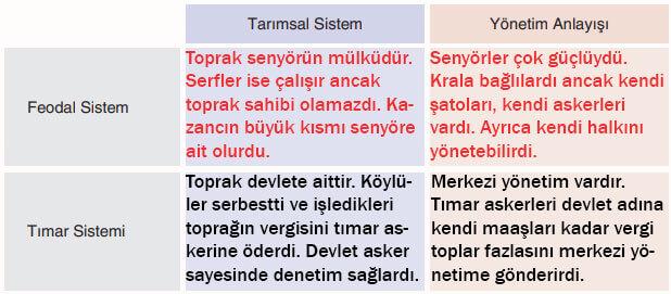 Cevap: Feodal sistemde köylüler neredeyse bir köle yerine konmaktadır ancak tımar sisteminde köylüler devlete daha az miktarda vergi vermektedir.